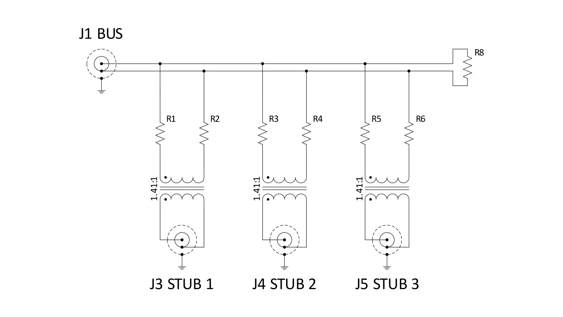 The standard coupling transformer ratio is 1:1.41 (step-up from bus to stub). This ratio provides the required signal levels at the stub side while maintaining electrical isolation and a common mode rejection ratio greater than 45 dB at 1 MHz.