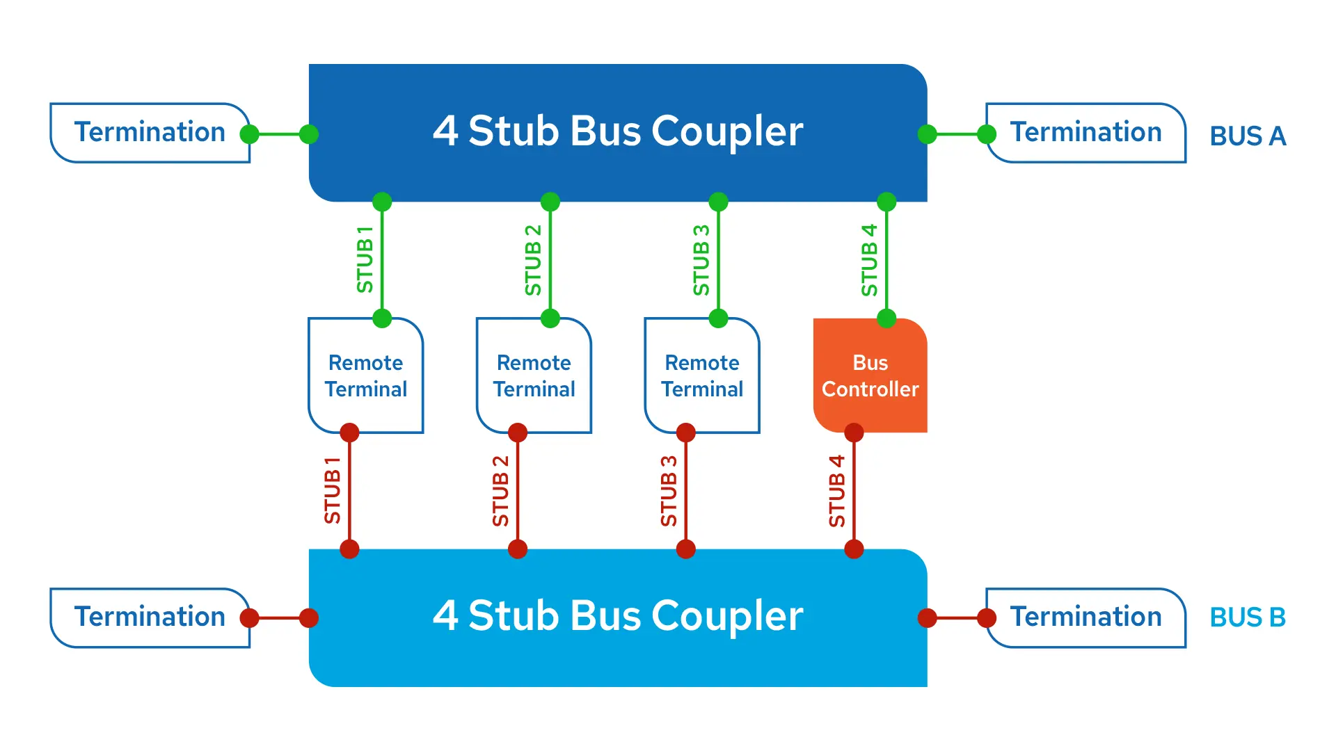 Stubs for Remote Terminals, Bus Controllers or Bus Monitors are connected to the bus through coupling boxes that provide single or multiple stub connections. Bus coupler provides the necessary shielding, isolation resistors and transformer interface. For dual redundant systems, each bus needs its own bus coupler for a stub. An example connection scheme is given below, termination resistors can be either outside or inside of the coupler: