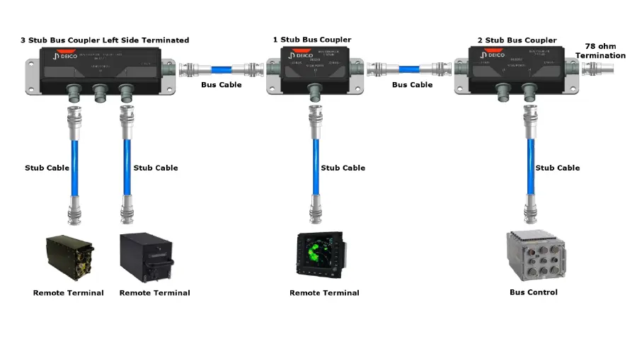 A MIL-STD-1553 network consists of a Bus Controller managing up to 31 Remote Terminals over a dual redundant twisted-pair data bus running at 1 Mbit/s with Manchester II encoding. Each terminal connects to the main bus through a short cable called a stub. The bus coupler sits at the junction between the stub and the main bus, housing the isolation resistors and transformer required by the standard. Termination resistors (78.7 Ω) can be located inside or outside the coupler. In a typical setup, the main bus cable enters the coupler on one side and exits on the other, while one or more stub connectors branch off to individual terminals.
