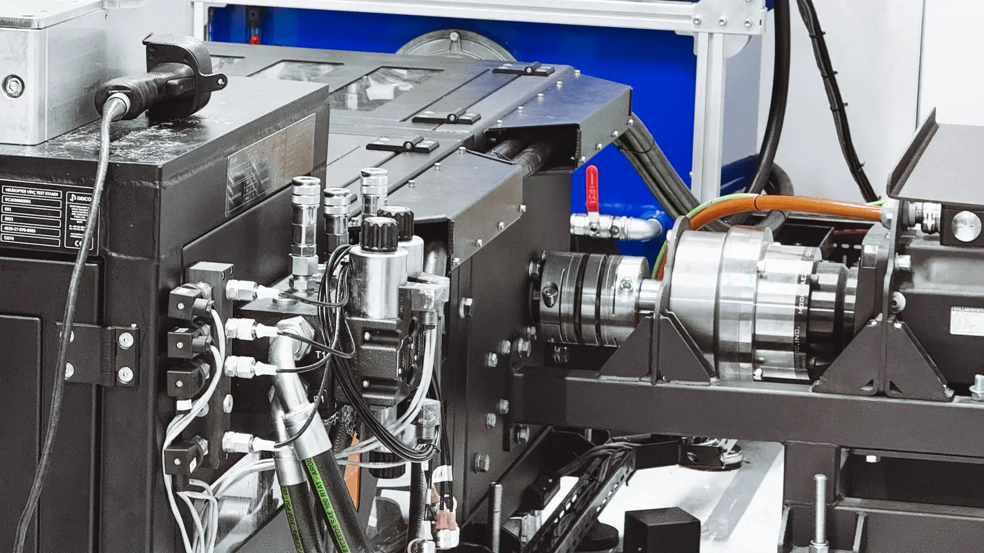 The system tests both hydraulic-powered and electric motor-driven helicopter hoist mechanisms under configurable load scenarios. Operators manage test sequences through a graphical HMI that displays live torque, speed, current, pressure, and position data. The automated Overload Clutch test runs with high-precision measurement and closed-loop control, requiring no manual intervention.
