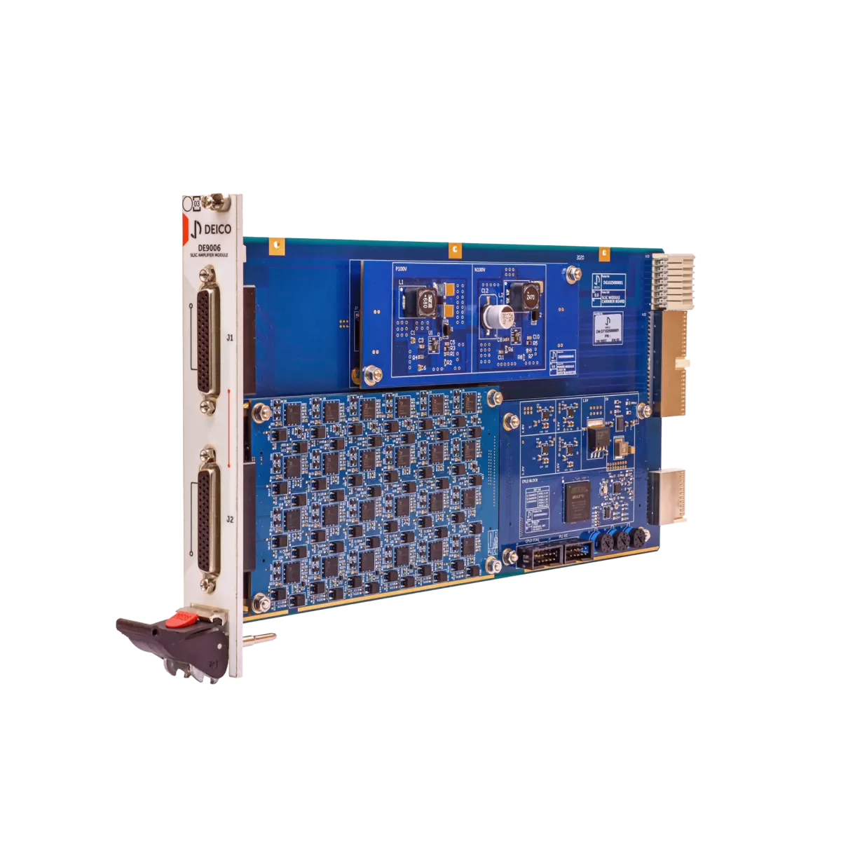 DE9006 SLSC Amplifier Module 30 mA is a 24-channel signal amplifier that is used in the SLSC chassis and connected to test equipment and DUTs. There are 24 amplifier blocks with 4.92 gain on it. Signal outputs are relay controlled. Relays are controlled by the controller block. SLSC chassis is necessary for module usage.