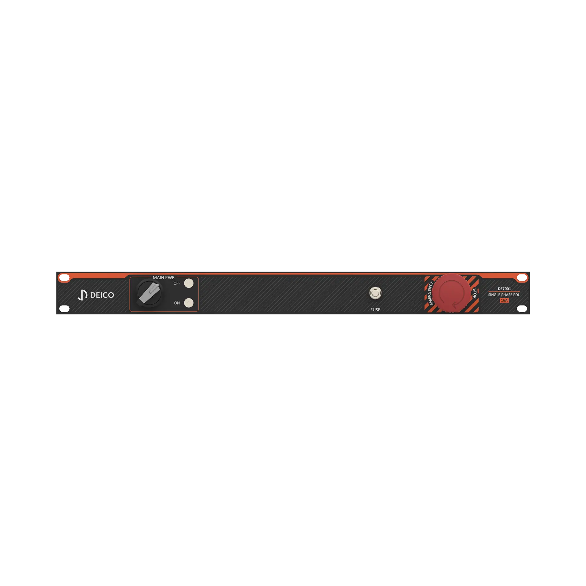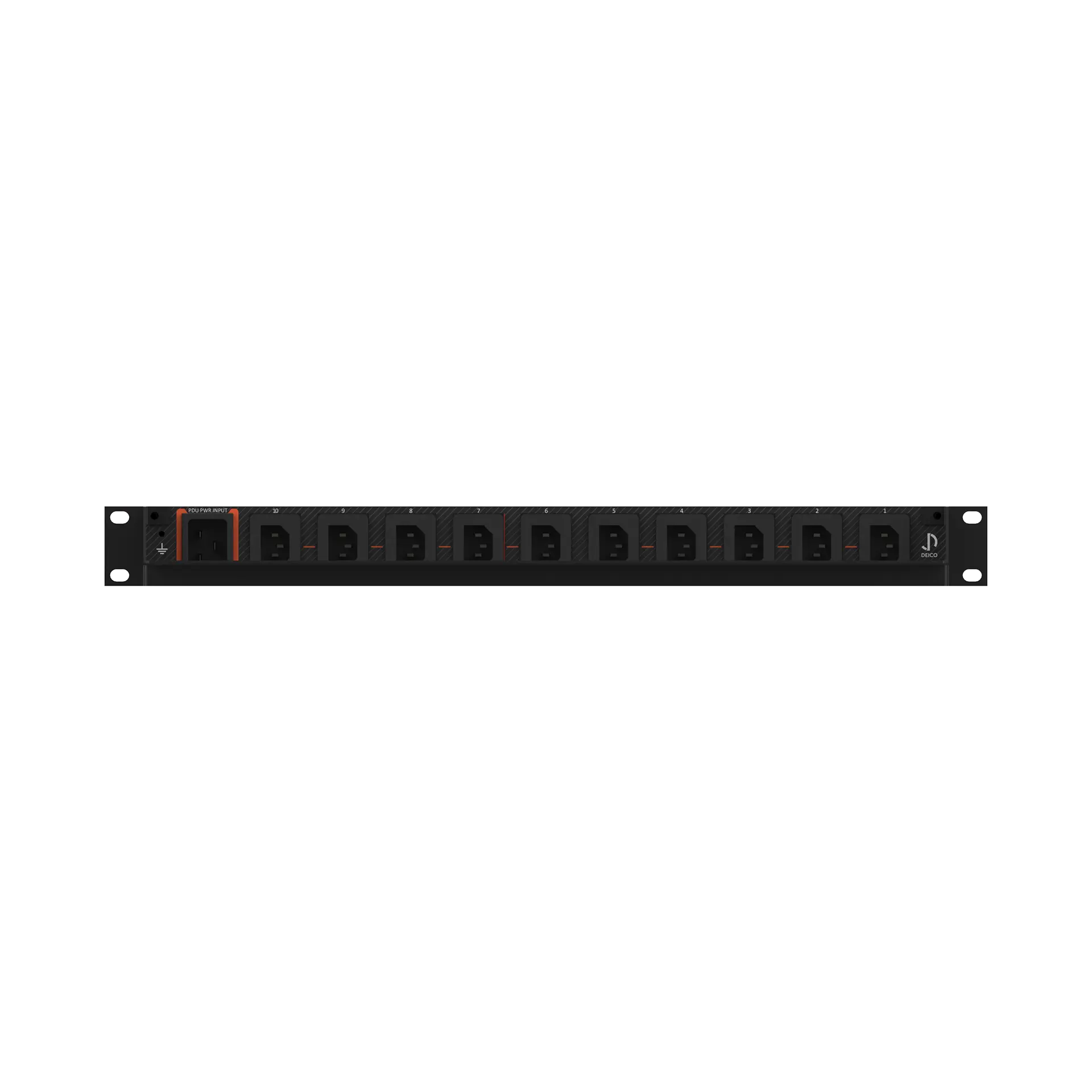 DE7001 Single Phase Power Distribution Unit 16 A is in a 1U form factor and offers 10 outputs. Switches are accompanied by led lights that indicate their status. The PDU is fed by a single-phase input, equipped with overcurrent protection, and has the ability to disconnect the input from the grid using an emergency stop button.